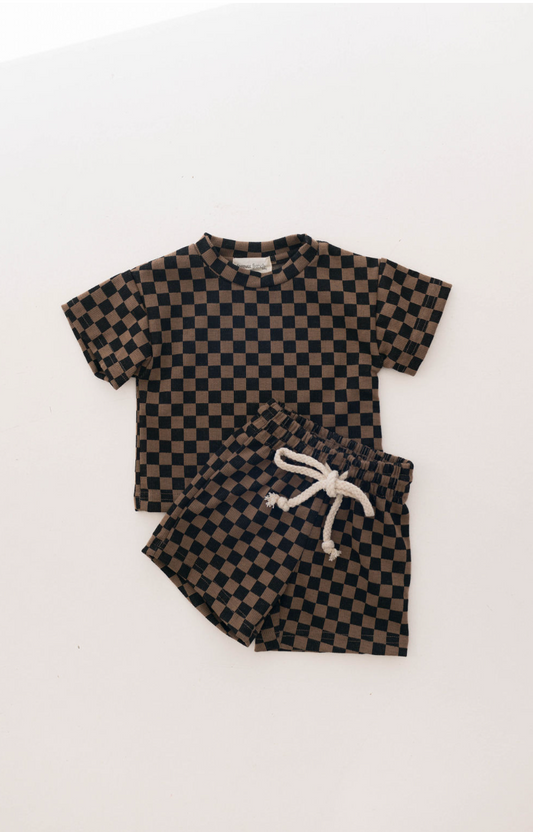 Ribbed Short Set Print: Black & Brown Checkerboard